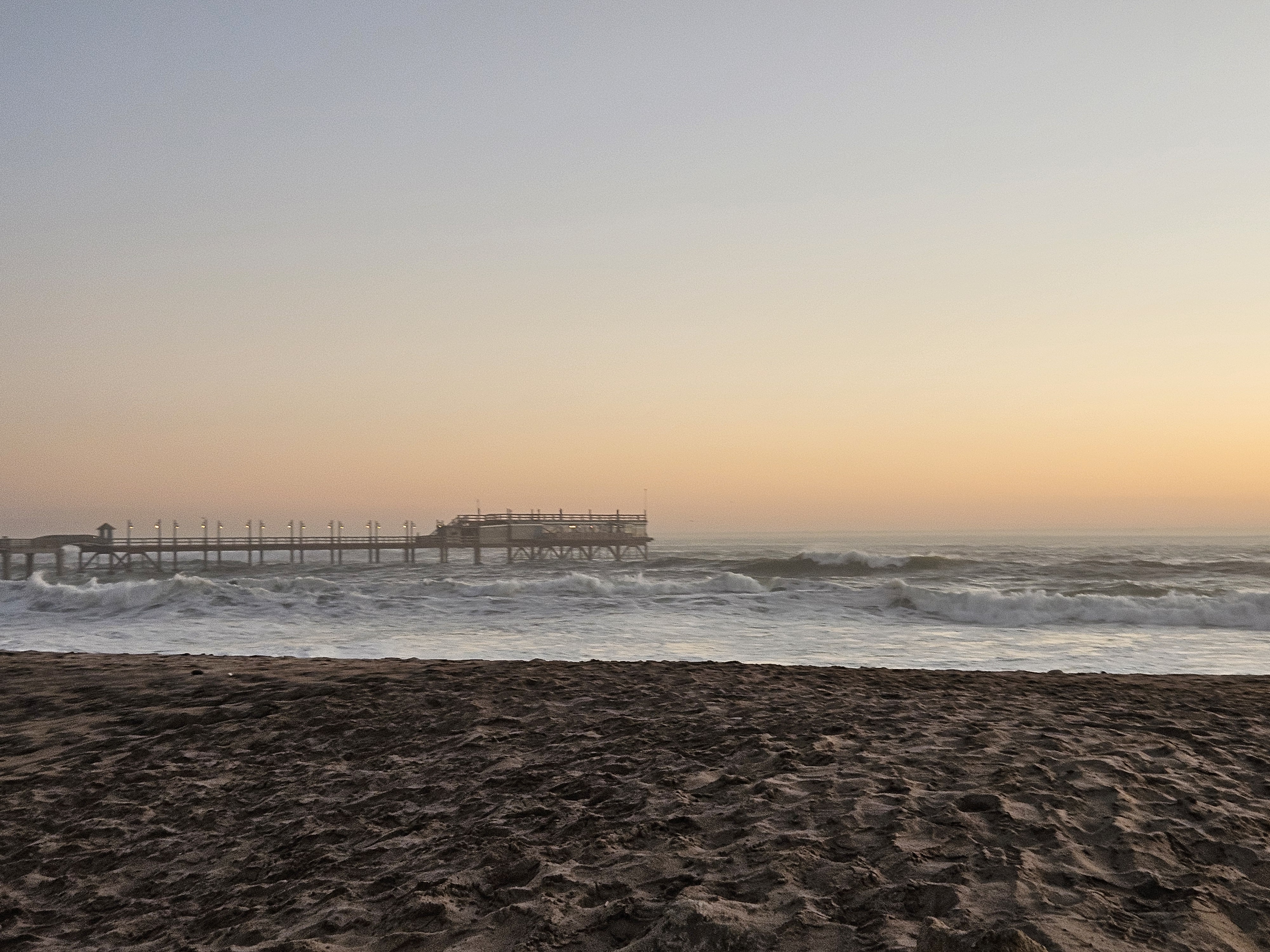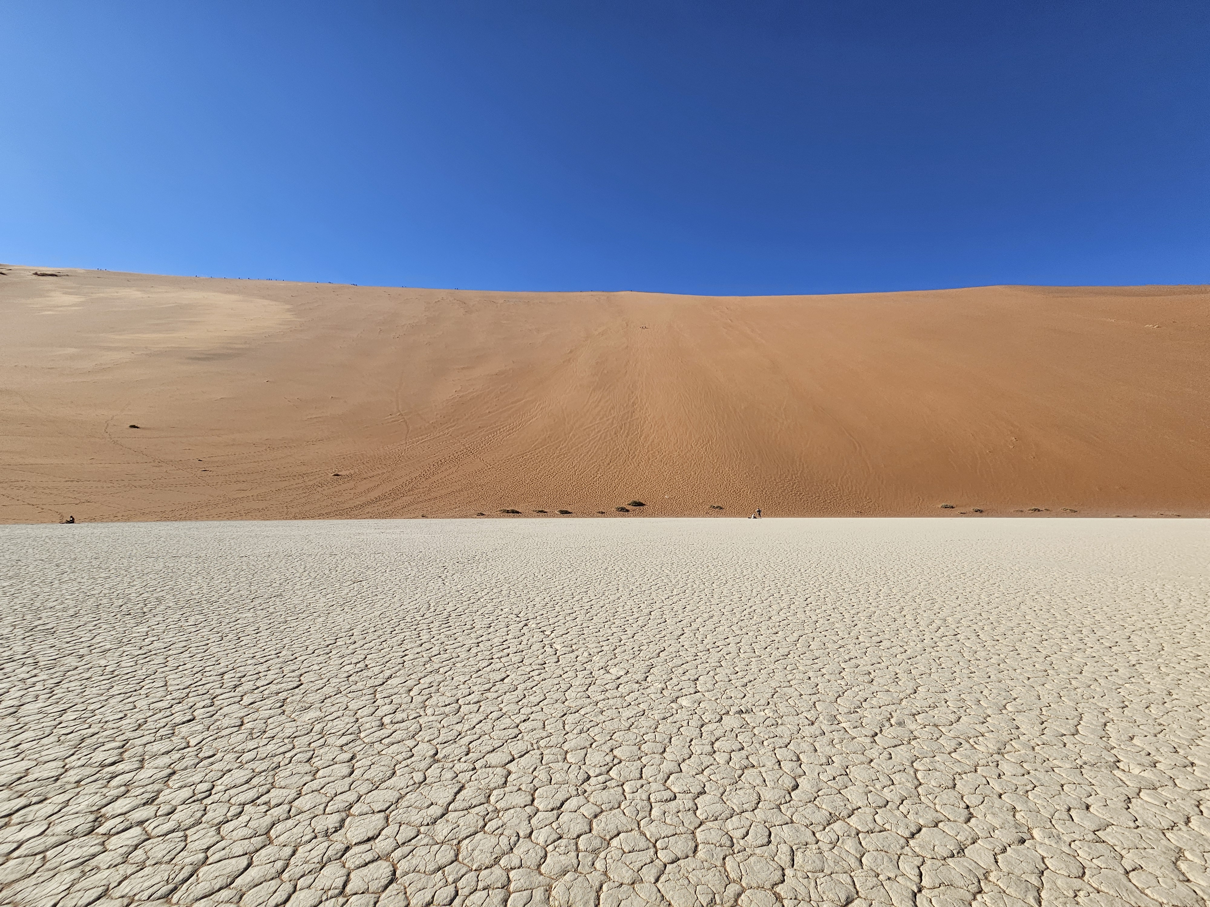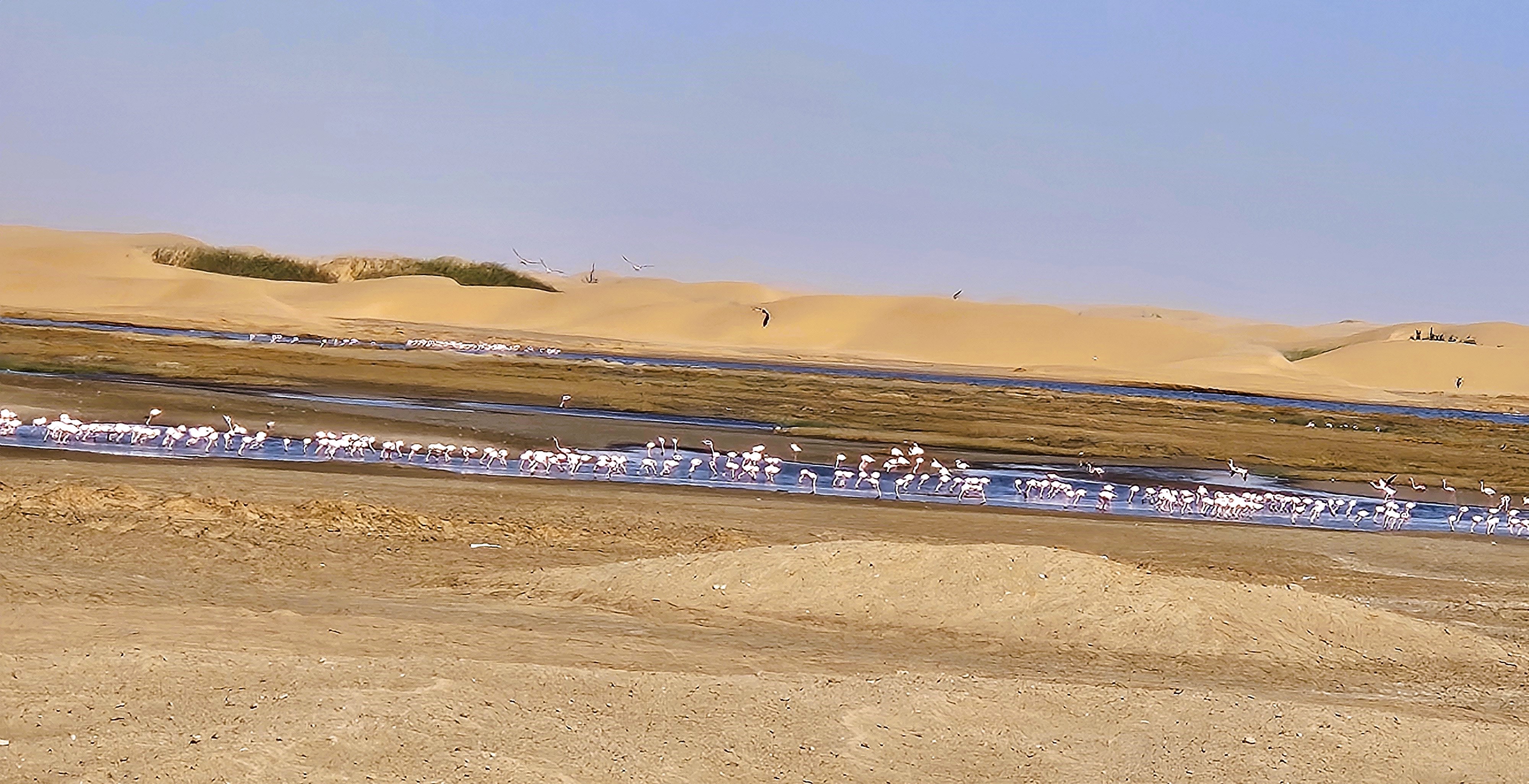 Pare che Sandwich harbour si chiami così perché la sottile striscia di terra che osserviamo dall’alto è stretta nella morsa fra deserto e oceano. Namib e Atlantico la cingono d’assedio da entrambi i lati, ma essa resiste, indomita, respingendo strenuamente i colpi dei giganti che mirano a sopraffarla. La sensazione di beatitudine che ci pervade somiglia a uno stato di grazia, a quando hai rotto il fiato e corri senza fatica, con la testa sgombra dagli impicci della quotidianità.