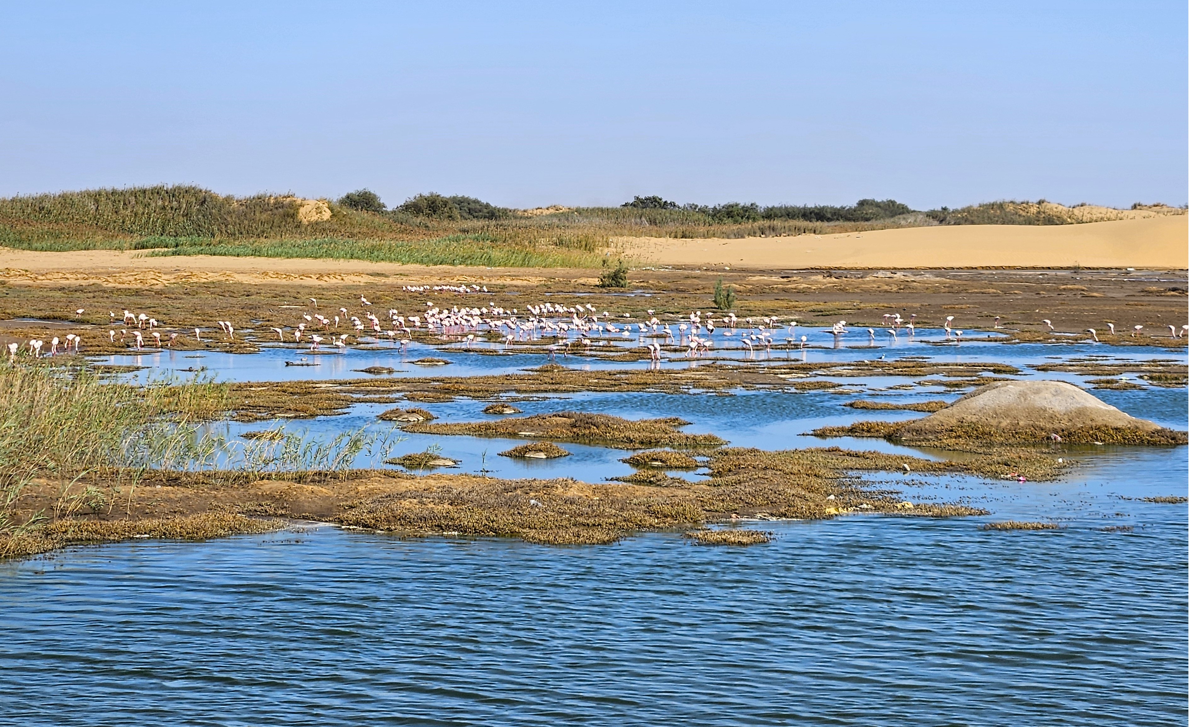 A quel punto rallentiamo e ce la prendiamo con calma, abbiamo tempo per bighellonare un po’. Mangiamo tranquillamente, per quanto la colazione (proprio oggi!) sia molto più scarna del solito. Andiamo a fare un giro. Prima portiamo i ragazzi in un parco giochi assai fatiscente: sembra più un bivacco che un luogo dedicato ai più piccoli. Notiamo un gruppo di non morti defilati fra gli alberi. D’un tratto svaniscono, assorbiti dall’ombra densa e ancestrale delle piante. Ci spostiamo lungo mare, in un punto in cui possiamo ammirare da vicino una quantità spropositata di flamingo.