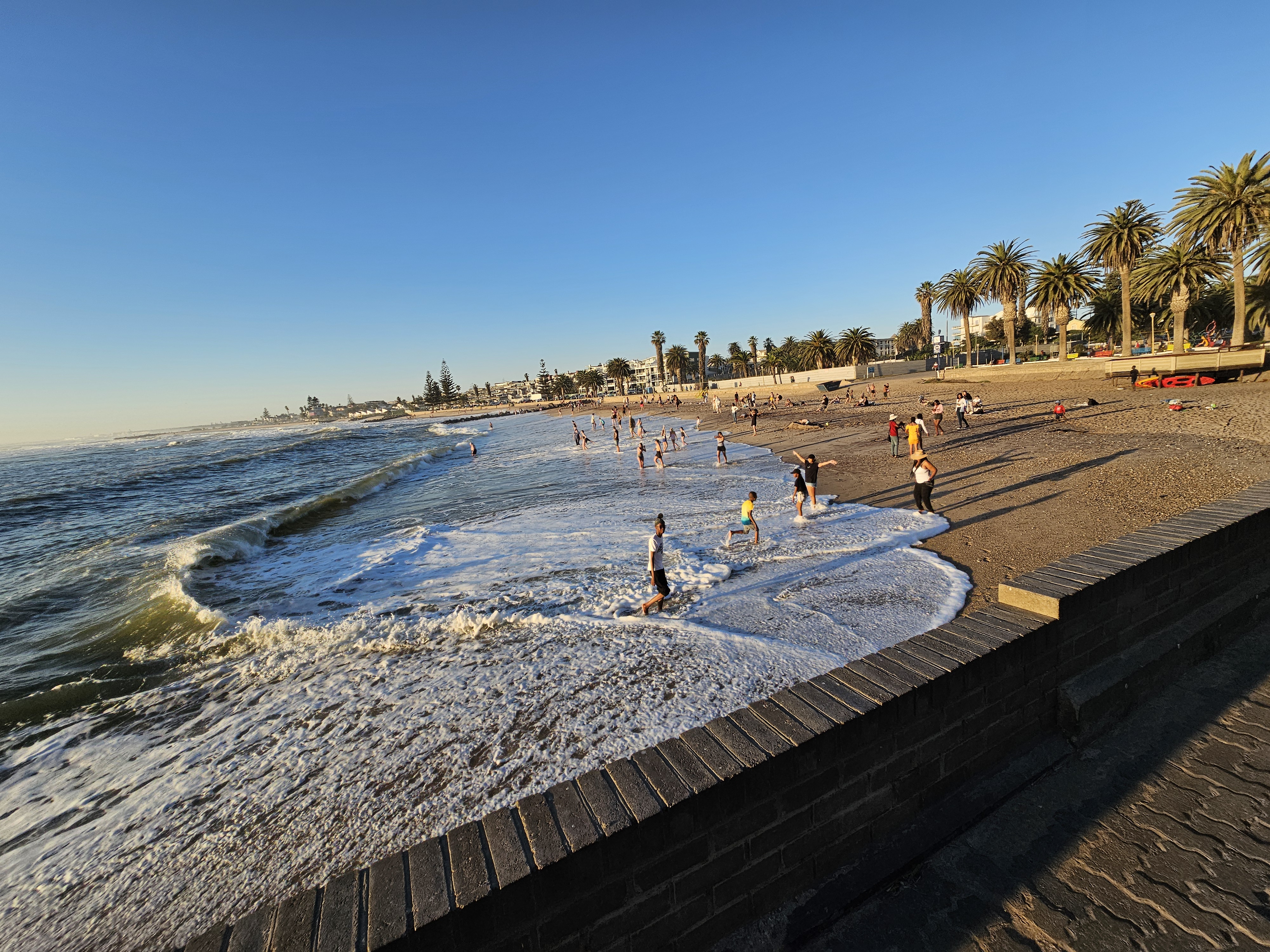 Attraversiamo immense saline, dove montagne biancheggianti e lunghi canali dominano il paesaggio. A un certo punto ci fermiamo in prossimità di canali in cui l’acqua assume colorazioni che vanno dal rosa al rosso. Andrew ci spiega che in quell’acqua vive un minuscolo gamberetto rosa di cui i fenicotteri vanno ghiotti. E sembra sia proprio quell’animaletto a munirli della tipica colorazione. Avvistiamo tantissimi uccelli lungo la costa, fra cui maestosi pellicani.